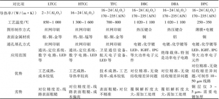 功率型电子封装散热基板除了电气连接与散热功能之外, 还需要同时具备一定的绝缘、耐热、耐压能力与热匹配性能。因陶瓷基板具有优异的导热与绝缘性能, 在功率型电子元器件的封装应用中优势凸显, 是日后功率型电子封装散热基板的主要开展方向之一[33]。LTCC、HTCC、TFC、DBC、DBA、DPC工艺陶瓷基板的主要特征如表1所示。