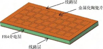在制造工艺技术瓶颈不断突破的背景下, 陶瓷基板脆性大是不争的事实, 如何利用其优异的导热性能为快速开展的LED产业给予散热管理方案, 并避免在生产与使用过程中因脆性过大而龟裂也是不容忽视的现实难题。乐健科技 (珠海) 有限公司利用激光切割或砂轮切割将大块陶瓷切割成若干小块, 并将其选择性地植入到FR4结构中, 利用压合的工艺将陶瓷与FR4结合在一起形成复合散热结构。其中, 陶瓷充当芯片的散热通道, 使电子元器件在工作过程所产生的热量能够沿着陶瓷迅速向外界扩散, 避免散热不良导致元器件可靠性降低, 从而造成过早失效的风险, 如图1及图2所示。这种设计不仅保留了陶瓷的散热功能, 而且解决了陶瓷易碎的难题。同时, 可以在FR4上实现机械加工, 极大地降低了纯陶瓷切割时的高昂成本。现在, 该类复合基板材料已经在大功率LED和IGBT等领域得到了一定规模的应用。